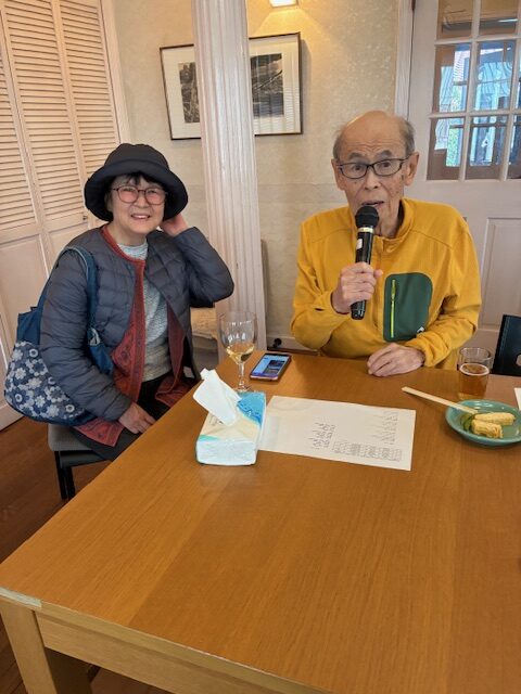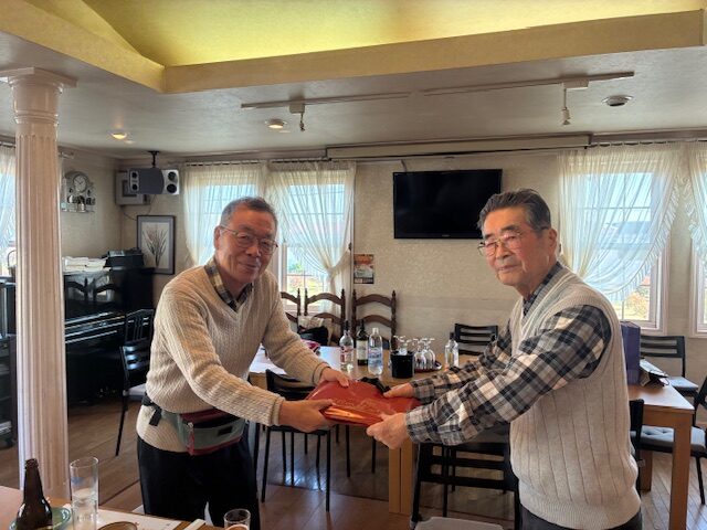 いつもより長くお喋り食事時間をとって、よもやま話に花が咲きました。今月の誕生19日にめでたく満90歳を迎える吉松さんにお祝いのクッキーが贈られました。喉慣らしの今月の唄は下山が選曲したフランク永井「公園の手品師」で季節に合わせました。意外と知らない人が多く、録音を聞いたあと吉松さんが改めてカラオケで披露しました。併設の中華そば「孫市」一度は食べたいというメンバー代表?で途中最年少の谷中さんが抜けて奥州白河中華そばトラヤ直系味を賞味してきました。麵・スープとも極めて美味だったようです。終盤には迎えに来られた久保田夫人も交えご主人の演歌に聞き入りましてフィナーレは紺碧の空と校歌を全員で歌い上げ廣田さんがエールで締めました。